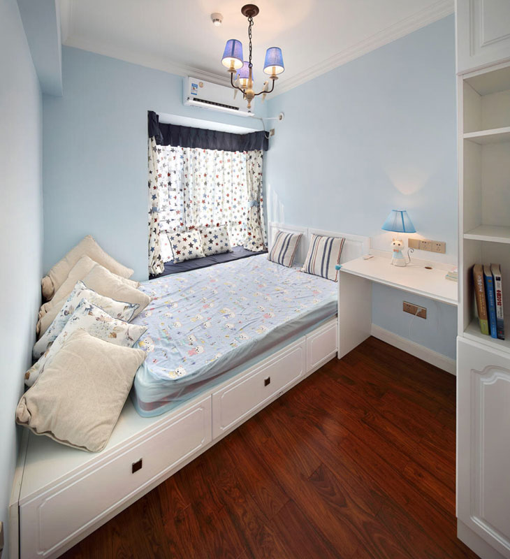 如果臥室里有凸窗的話,可以沿著凸窗的臺(tái)面向室內(nèi)延伸,同事將延伸部分的地面抬高,再用木板貼裝在表面,使凸窗及其延伸部分稱為一張床架,在上面鋪上床墊,再用軟裝裝飾一下,人就可以舒服地睡在上面了。這樣就省掉了買床架的錢,同時(shí)也省掉了不少擺放床的空間,在床架下面做一些抽屜,還能用來收納雜物,一舉多得。