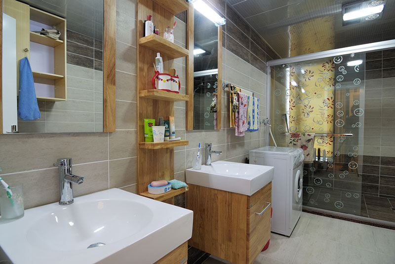 一般洗漱臺旁是有一個位置是剛好空置下來的,所以為了不過多占用洗漱區域的空間,在擺放洗衣機的時候可以考慮在洗漱臺旁邊擺放,剛好洗漱區域和淋浴房間隔很少,在使用洗衣機的時候可以更加方便
