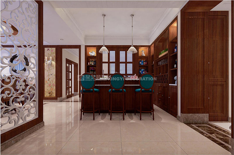 鳳景灣260平裝修設計案例說明:本案業主置業時為了考慮和小孩長時間一起居住,故意買了兩套130平米的套房連在一起裝修,功能上一套是父母居住,主人的起居室,品茶區級棋牌室定義在父母那套,而廚房的中西廚,還有餐廳空間在小孩居住這邊。風格定義為英倫風格,它體現出的是一種典雅莊重,兼具紳士風度的住宅空間,業主的傳統素養,嚴謹的做派在此套住宅中得到了完美的詮釋。步入室內。一條主線貫穿玄關,廚房,餐廳,客廳。深色木墻與米黃色皮革軟包相互搭配,咖啡色系的花紋布藝,沙發,沙發底部地毯豐富了室內的生活氣息,沉穩而不古板。