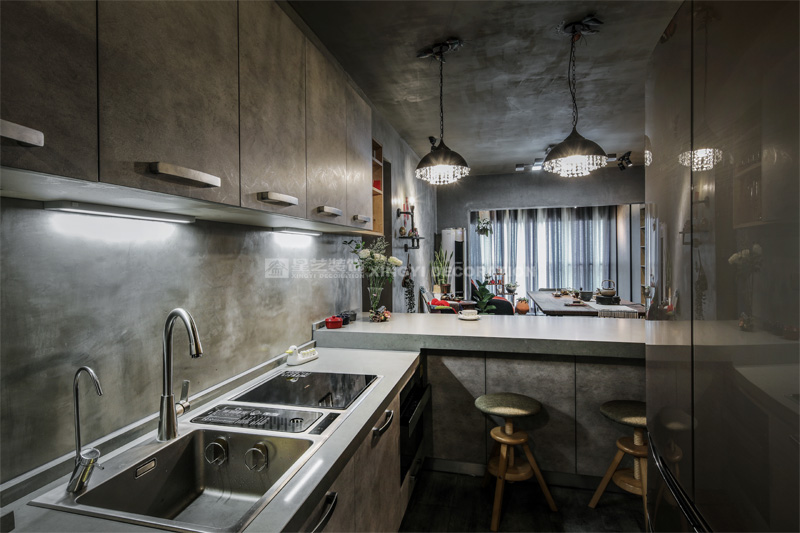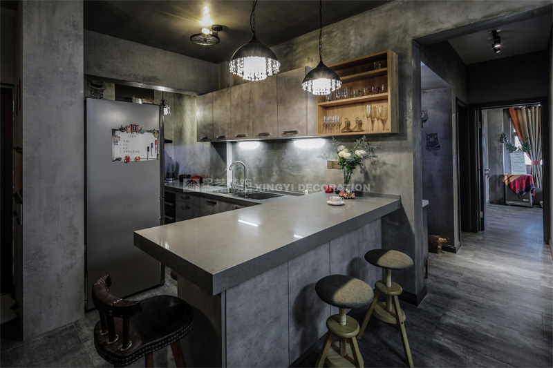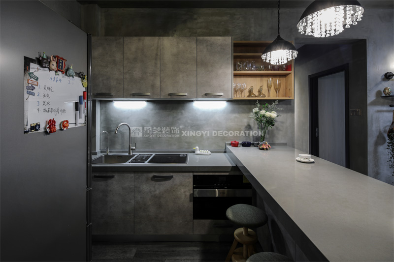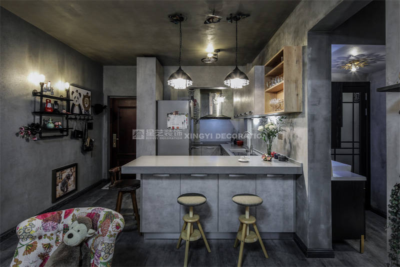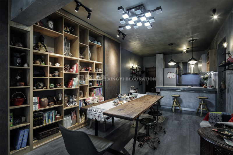 南寧星藝裝飾陶佳彤設計師專業設計的霖峰壹號90平工業風裝修實景完工案例,本案位于霖峰一號,屬于鳳嶺北地帶。業主是兩位中年夫妻,一個男孩。對于生活品質要求比較高,生活上飲食用具喝茶都是用銀壺和銀筷子。那業主是一位酷愛旅游喝茶和運動的文藝女青年,這個房子是用來偶爾度假休閑用的。所以整個空間里面看不到有沙發存在,剛才是接觸業主的時候,提到幾點,收納空間一定要多,不需要餐桌和沙發。每天都需要泡個美容澡。在布局上就把原來的陽臺封起來沒做成浴缸區域,那廚房和餐廳就可以連起來做成吧臺和櫥柜一體的造型。客廳區域做成滿滿一幅收納柜子滿足業主喝茶時候把所有的茶具,又可以做展示偶然。原來的大陽臺也納入客廳喝茶區,整個視覺都開闊起來了。清風吹起,香爐里的檀香,伴隨著音樂和業主泡好的茶,那就是人生的一個享受。