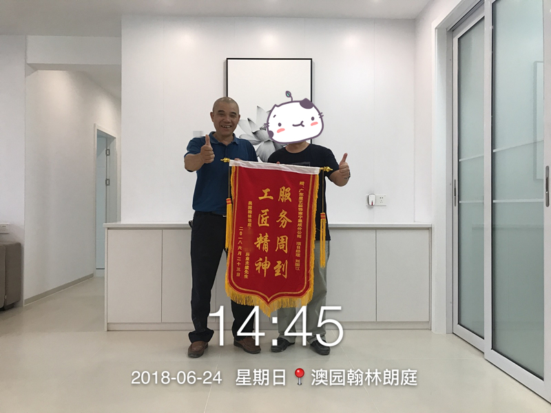 2018年6月23日,奧園瀚林朗庭業主送來錦旗稱贊廣東星藝裝飾南寧公司項目經理劉國江工匠精神,服務周到。