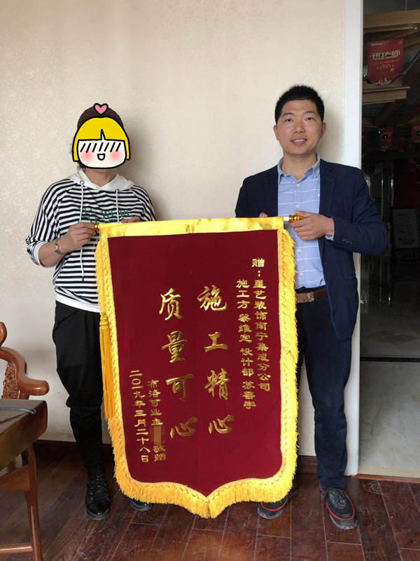 2019年3月28日,嘉和城布洛克業主為感謝項目經理黎維定和設計師蘇善宇,專門贈送錦旗,錦旗內容:質量可心 施工精心 。星藝一直堅持做裝修等于做朋友的理念,不斷地從設計、材料、工程及管理方面進行創新、優化,走在家裝行業的前列。