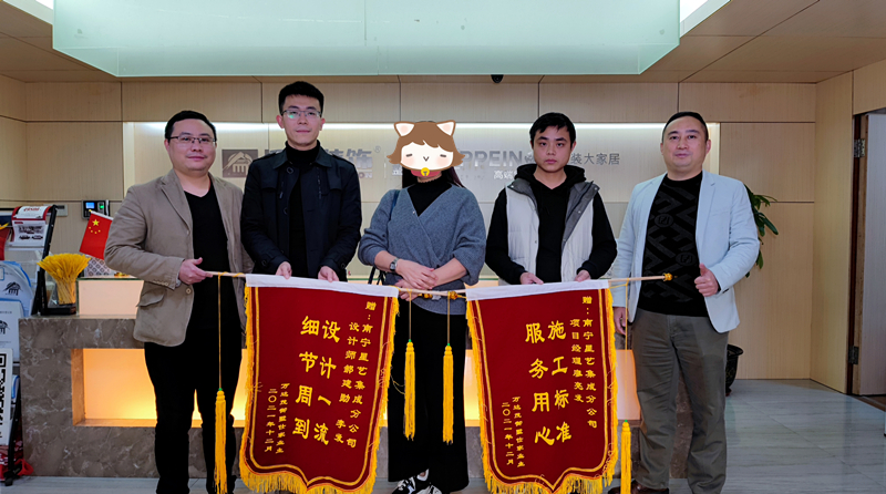 2021年12月5日萬達茂御墅仕家業主來到星藝裝飾麻村店,贈予設計師李發 郝建勛和項目經理 廖亮發錦旗 ,贊揚他們設計一流 細節周到 施工標準 服務用心 ,星藝裝飾馬村店總經理胡總和設計總監屈工一起合影
