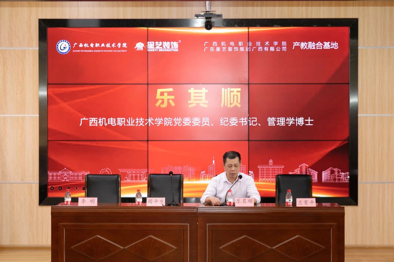 緊接著,廣西機電職業技術學院校紀委書記樂其順上臺致辭,樂書記先是代表學院對星藝南寧代表和嘉賓的到來表示熱烈歡迎,在了解完星藝裝飾發展歷程后,也分享了學院師資力量、教學模式等,強調此次校企合作的重要性和意義,并對校企合作培訓班的未來發展提出期望和要求。