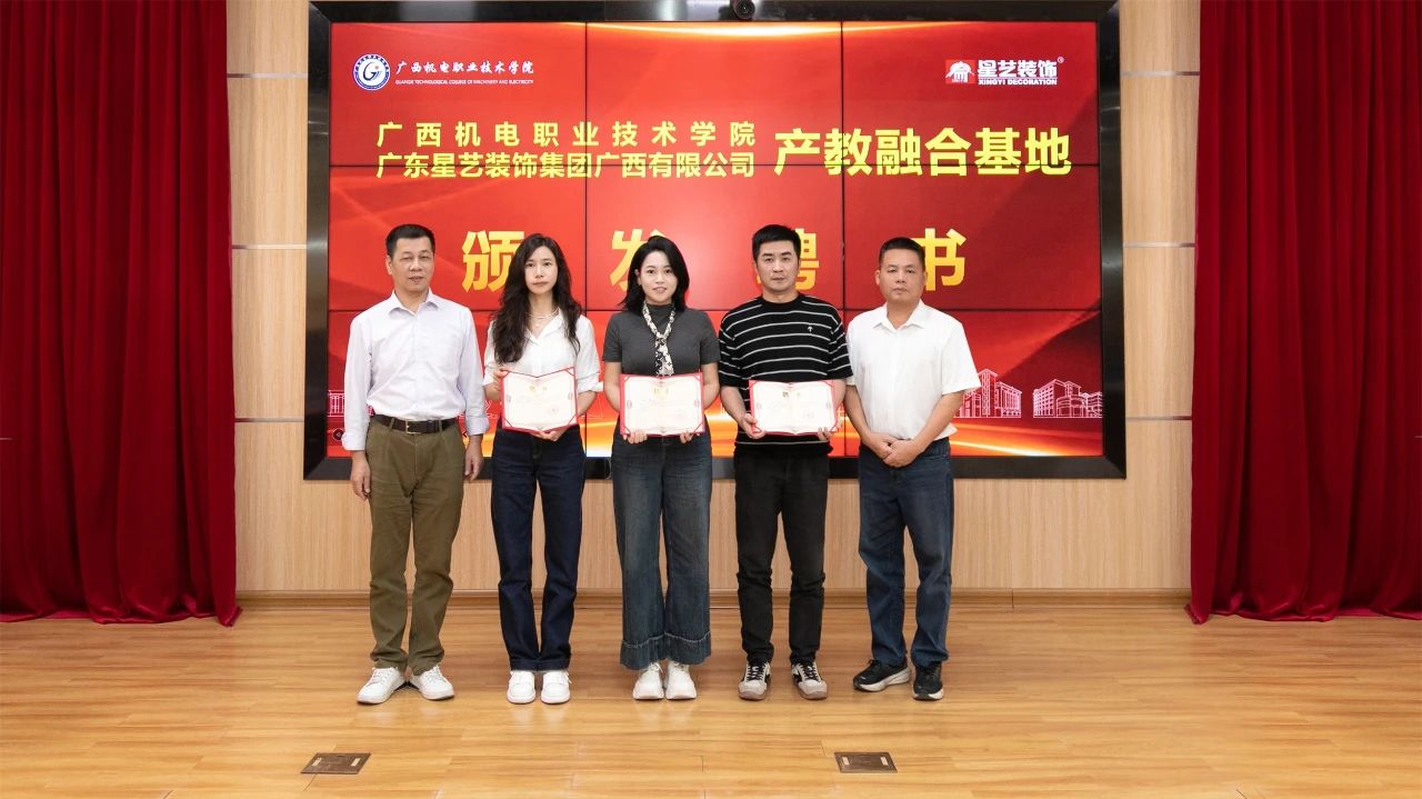 星藝南寧設計羅芳、譚淑文、周平秤三位設計師被廣西機電職業技術學院聘請為學院“客座教授”,并在會議現場頒發聘書。