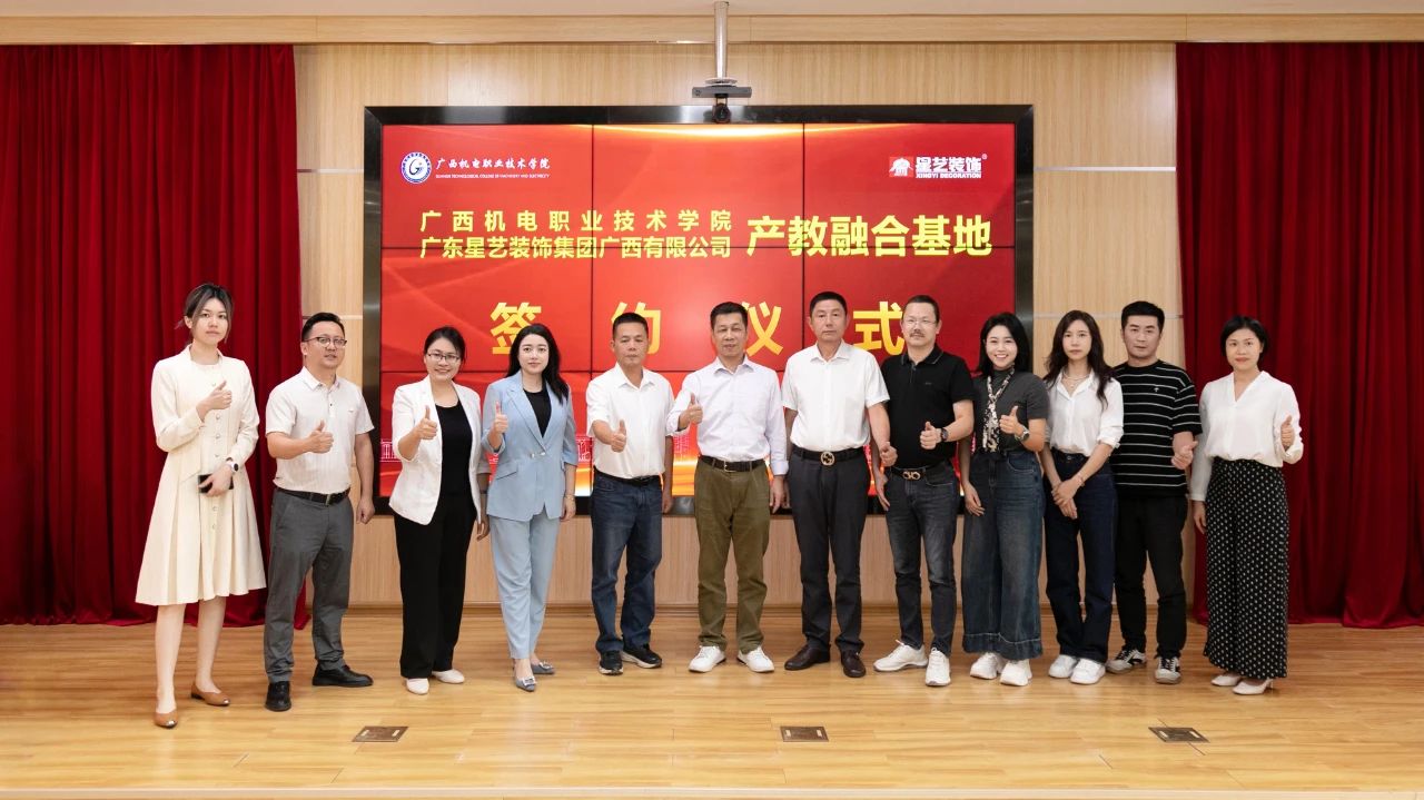 10月24日下午,星藝裝飾與廣西機電職業技術學院“校企合作聯合培養基地”簽約儀式在學院第二學術報告廳隆重舉行。星藝裝飾南寧區域總經理周平生、南寧區域總監李明、設計總監羅芳、周平秤、譚淑文、人事經理李夏靈一行,受到學校校紀委書記樂其順、工業設計學院院長蘭育平、黨委副書記黃梨錦、副院長任慧敏、室內教研室老師徐成、李翠萍、環藝教研室老師王衍融以及學校師生的熱烈歡迎,校企雙方就人才培養、產教融合進行探討并簽署協議。