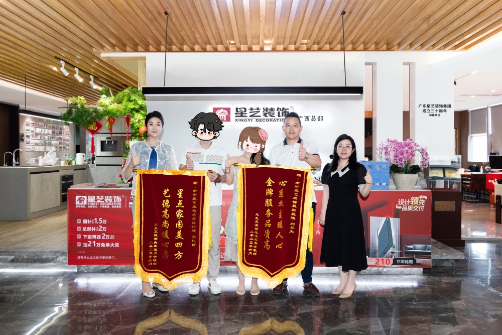 2025年6月12日,星藝裝飾集團南寧分公司匯東店內洋溢著喜悅與榮光。滿懷感激的業主親臨門店,將兩幅飽含深情贊譽的朱紅錦旗,分別贈予設計師李欣倩女士與項目經理劉晨光先生,并與他們親切合影,共同記錄下這彰顯卓越服務與深厚情誼的珍貴時刻。