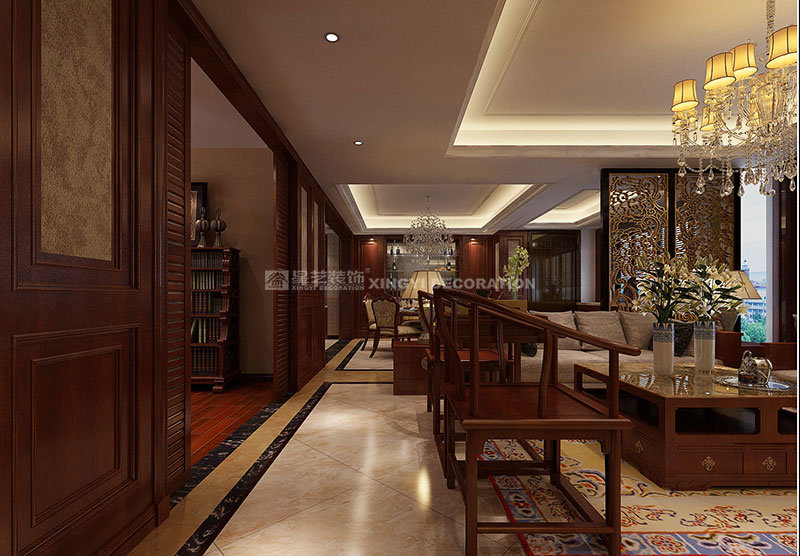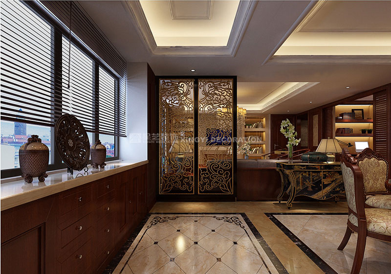 地面采用石材拼花,用石材天然的紋理和自然的色彩來修飾人工的痕跡。使客廳和餐廳的那種奢華、檔次和品位毫無保留地流淌。 在家具配置上,多選用板木結合的實木家具,家具漆面具有封閉漆效果,不僅能將木皮的紋理盡情展示,在徒手觸摸時,還能感受到油漆飾面后的光滑、平整。
