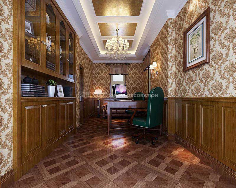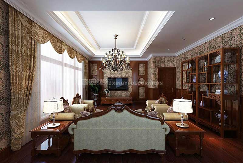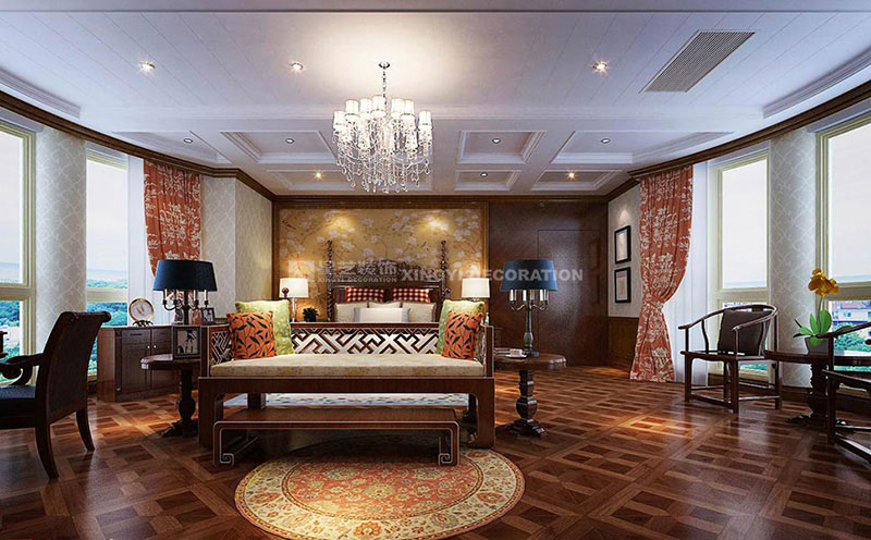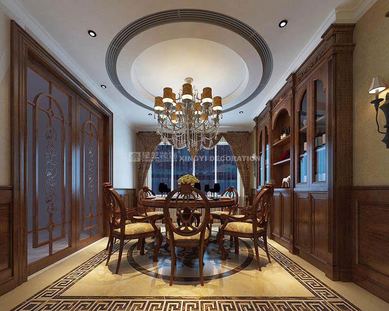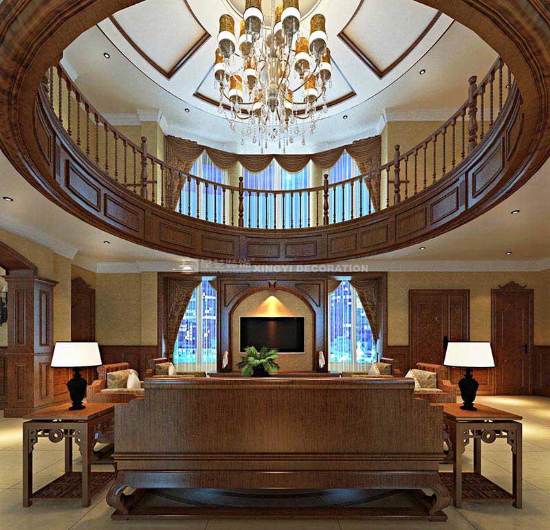 回歸生活的最初點,本案采用現(xiàn)代的設(shè)計手法闡釋古典美式,在原有傳統(tǒng)美式的住宅空間格局下,配置有中國傳統(tǒng)的中式家具,賦予室內(nèi)中西合璧生活的文化氣息。挑空圓形的大堂擺放大尺度中式紅木家具,更顯品位。