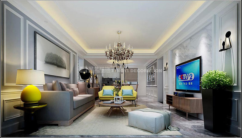 客廳以灰白為基調(diào),電視背景中央采用整塊的進口爵士白大理石,既簡潔大方、又高雅精致,墻面的石膏線框設(shè)計顯現(xiàn)出新古典的設(shè)計元素, 跳躍的黃色布藝沙發(fā)和臺燈使客廳瞬間活躍起來,也成為了客廳效果圖的點睛之筆。