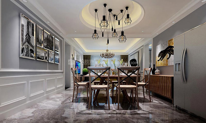 餐廳墻面的設(shè)計延續(xù)了客廳的設(shè)計元素,但又有些許的改變,不至于過于雷同單調(diào),吊頂采用是“天圓地方”的設(shè)計理念,既美觀也符合中國人的風水情節(jié)。