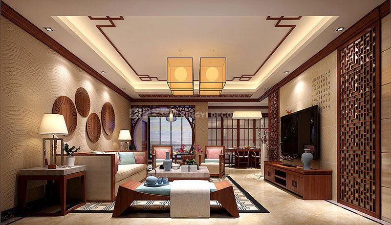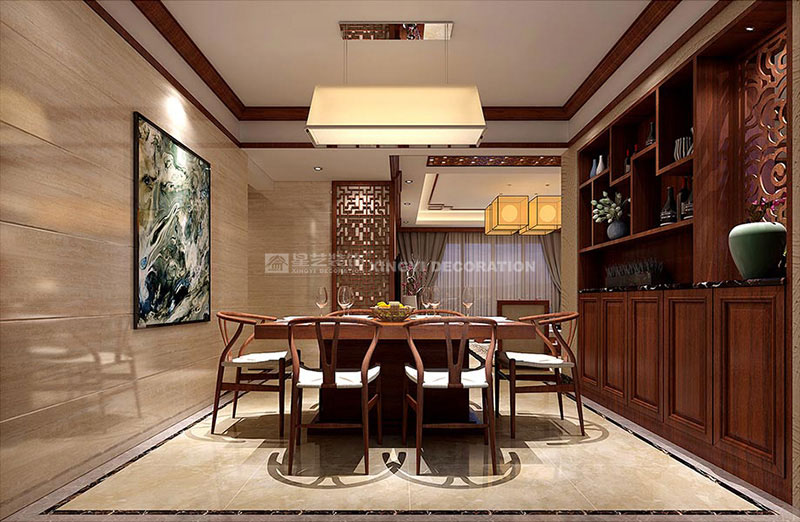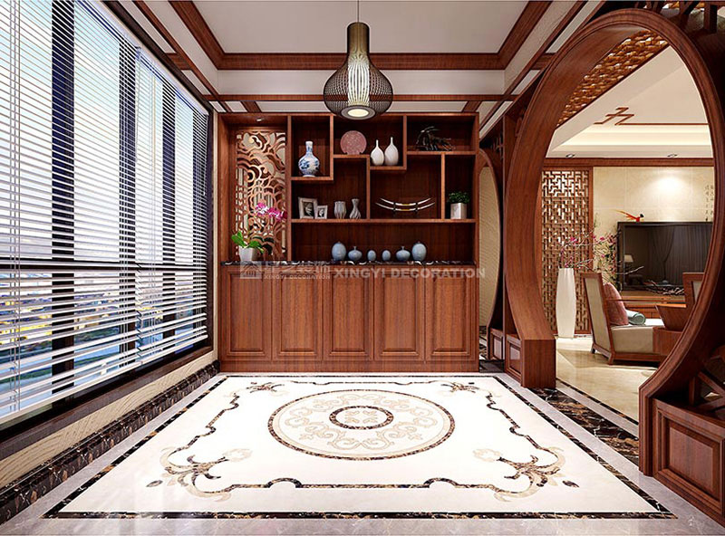 人對一個空間的感覺是在前七秒產生,所以入戶區對整個空間的重要性。 進入本案例,映入眼簾的是:左邊是小區花園的美景(把室外的引入,做到室內外相交融),右邊是曲線美的月亮門,讓中式空間的延伸更有內涵。正對的是整面的裝飾博古架,擺放著主人精心呵護的綠植、有旅游帶回來的飾品擺件、有中式的青花瓷,還有。。。。。。