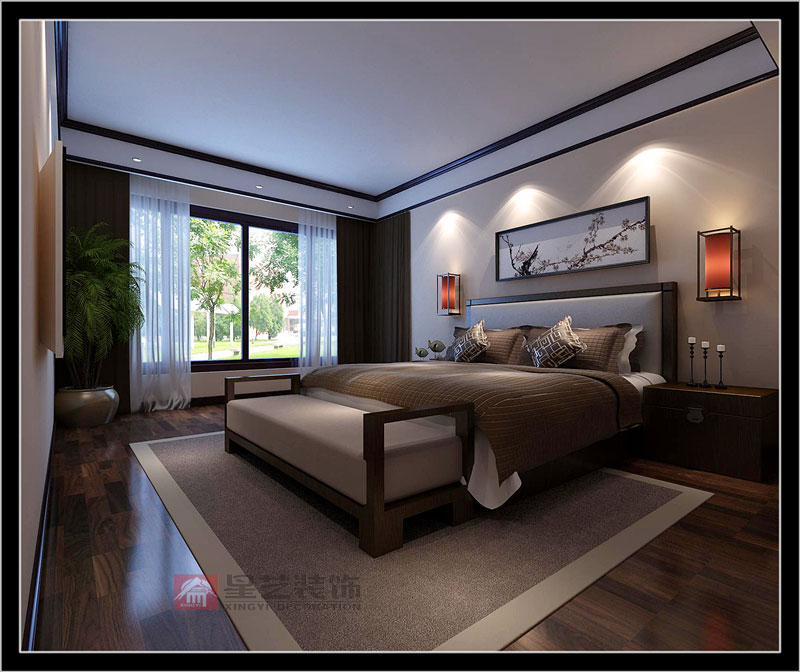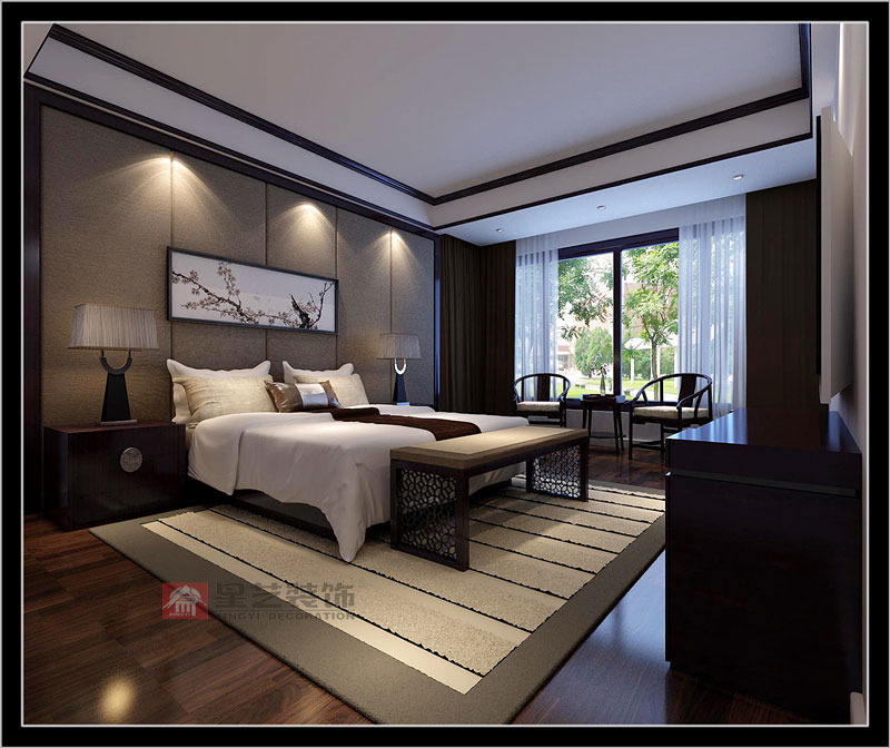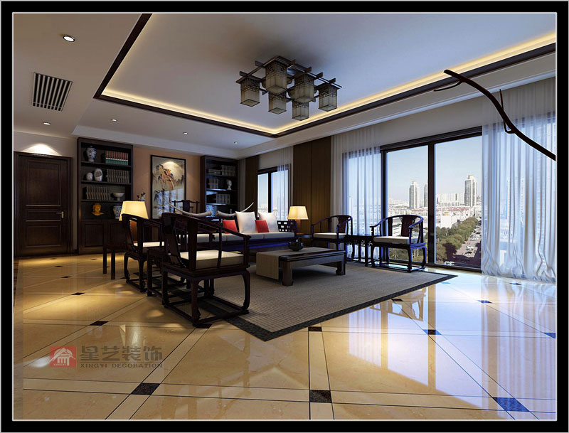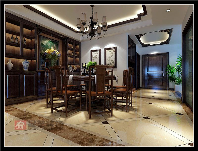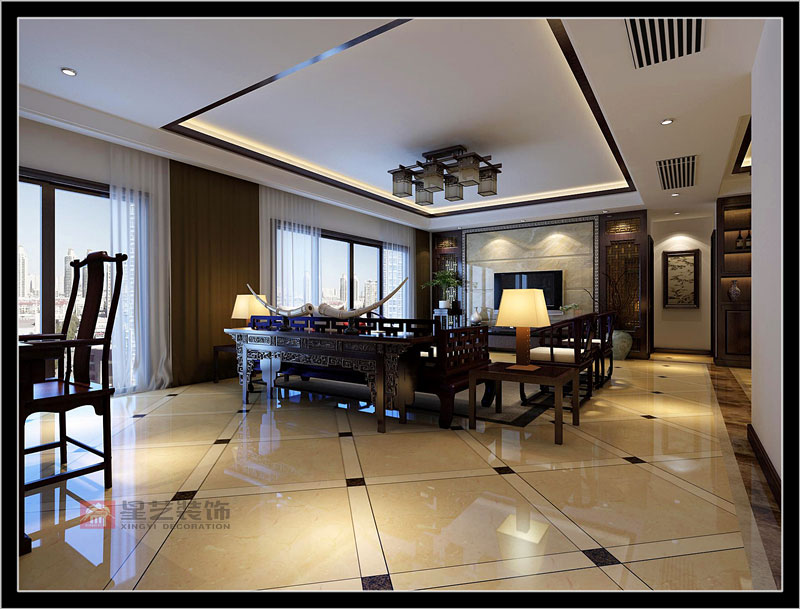 本戶型采用新中式的設計風格手法來進行整體的調性設計,本戶型整體面積較大,考慮運用進新中式風格一方面讓空間有足夠的氣場體現戶型,一方面用人們熟悉的具有代表性的中式家具來打動客戶,整體以古典古香的基調、家具與裝飾的搭配為主,利用古老的家具——紅木的家具、太師椅、有雕飾的裝飾品以及燈光等等增添新中式原有的味道!