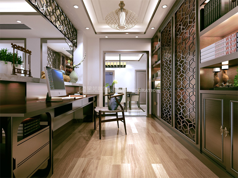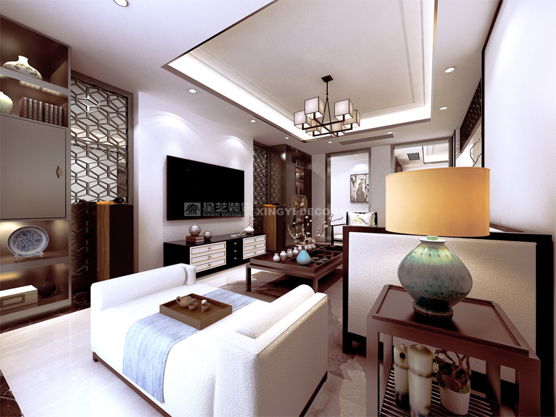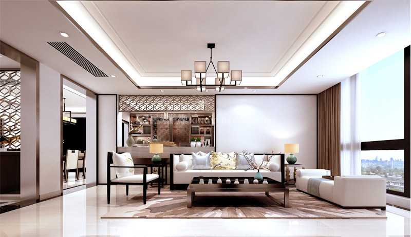 本案現代中式風格中透露出一種雅的意境,注重身心感受的這種情懷。它提取了中式風格中的代表性元素結合現代質感,在顏色、尺度、物料的重組中將中式風格賦予現代氣息整體色調以儒雅內涵的胡桃木色為主調,搭配湖藍與湖綠,以色彩表現悠然的東方意蘊。新的家具傳統的意像,地毯意像圖騰的視覺再造新空間,東方文化的美感融入現代生活。中式最講究和諧,所選擺設中有東方插花和中式元素擺件,處處透露出詩意的意境