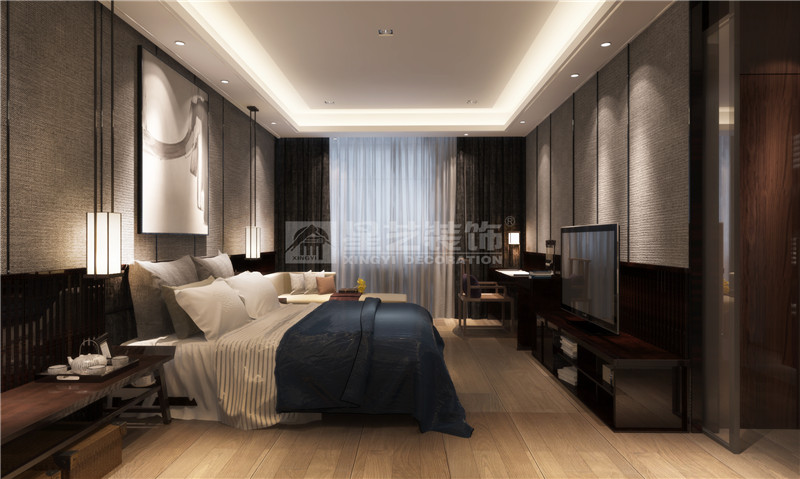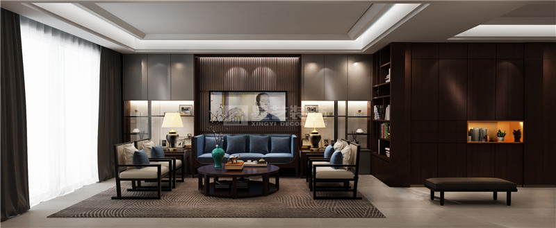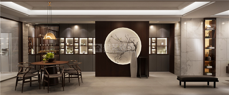 本案的業主我個人非常崇拜他,做事情認真執著,旅游的時候收藏了很多茶壺,喜歡簡約中式家具但又不喜歡繁瑣的裝飾,希望通過簡約的裝飾把他的收藏和家具能夠融入進去。我通過對展示柜的獨特設計和中式元素的一些精簡提煉,讓整個設計保留中式文化的獨特韻味同時又有簡約大氣的視覺沖擊!