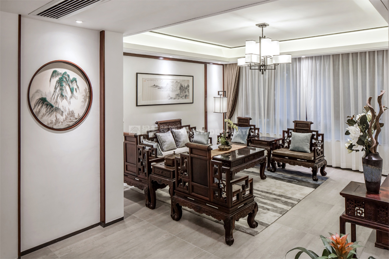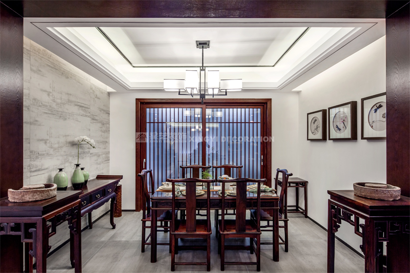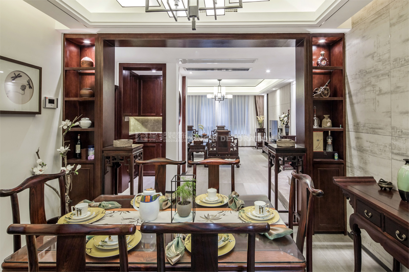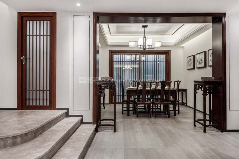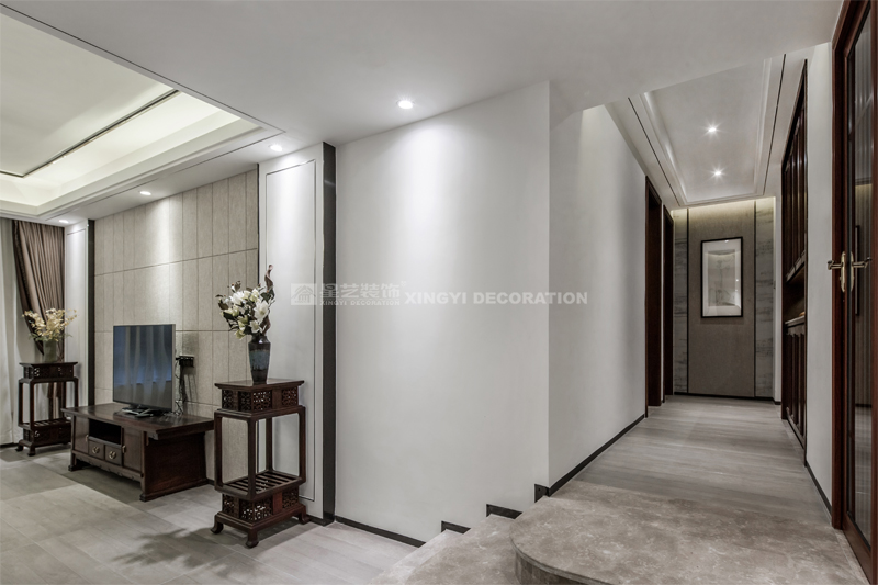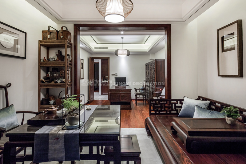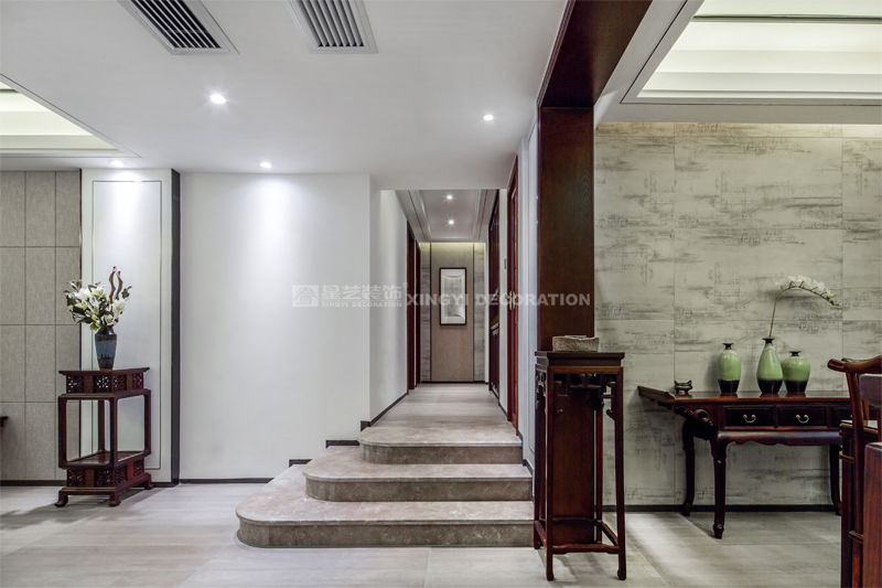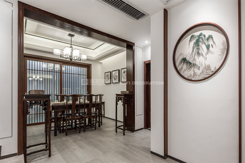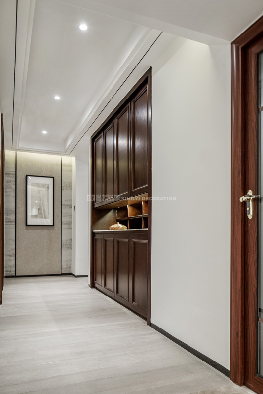業主是個十分看重文化底蘊的人,所以比較偏愛新中式風格設計,因此設計師在設計時需要用有限的空間設計出無限的意境,把業主的古典情懷表現出來。靈動飄逸的盆景搭配古香古色的原木家具、考究方正的中式燈飾和淡雅別致的水墨畫飾等,將新中式的神韻烘托得淋漓盡致,不僅極具質感,還將整個空間的意境提升了不少。入戶過道處設計得極為簡約,硬朗的線條將空間分割得極為方正,搭配上淡色的畫飾,將空間的延續性無限拉長。“時得悠然意,一拋名和利。茶香品斜陽,塵心難自還。”茶間的設計更能讓業主在紛擾的繁世中辟得一處幽靜之地,讓疲勞的心靈有所歸宿。