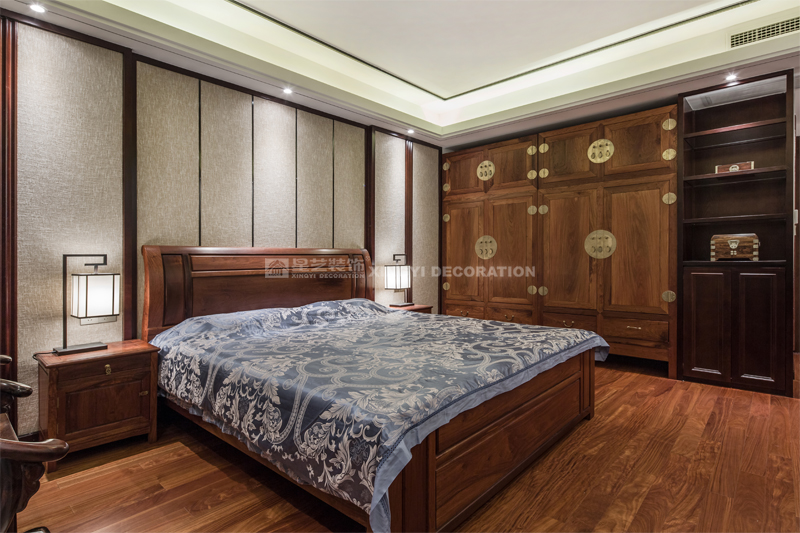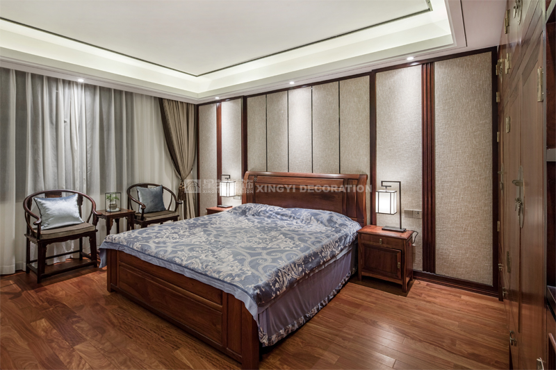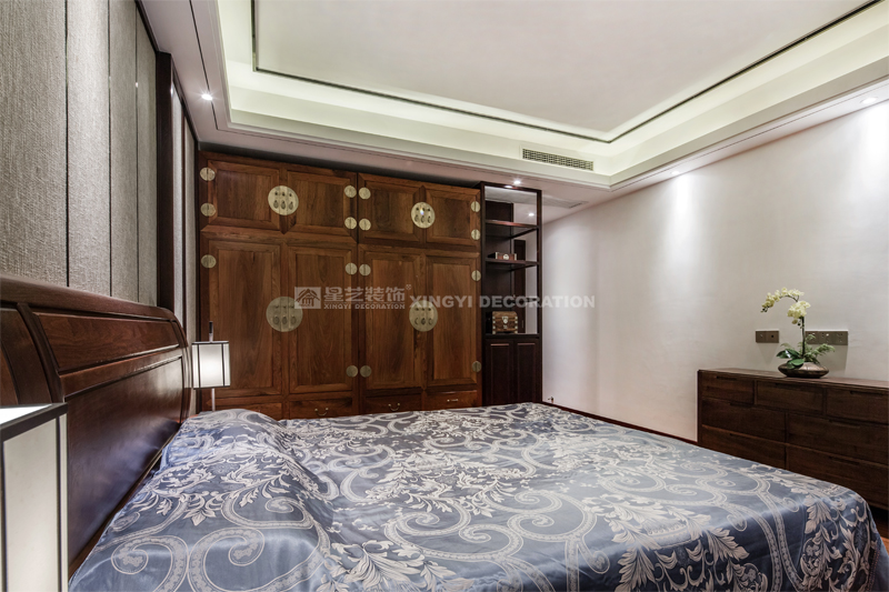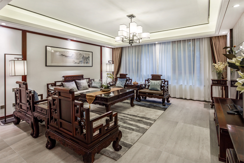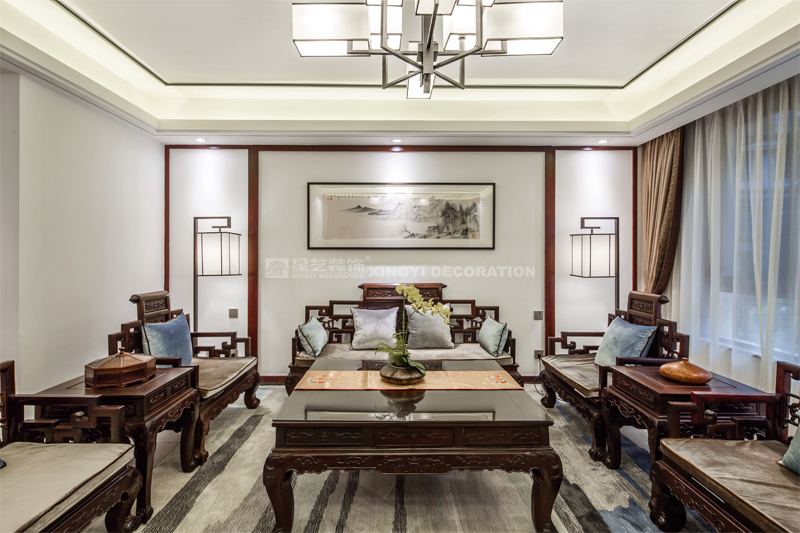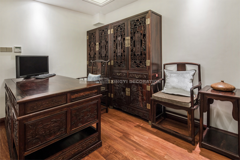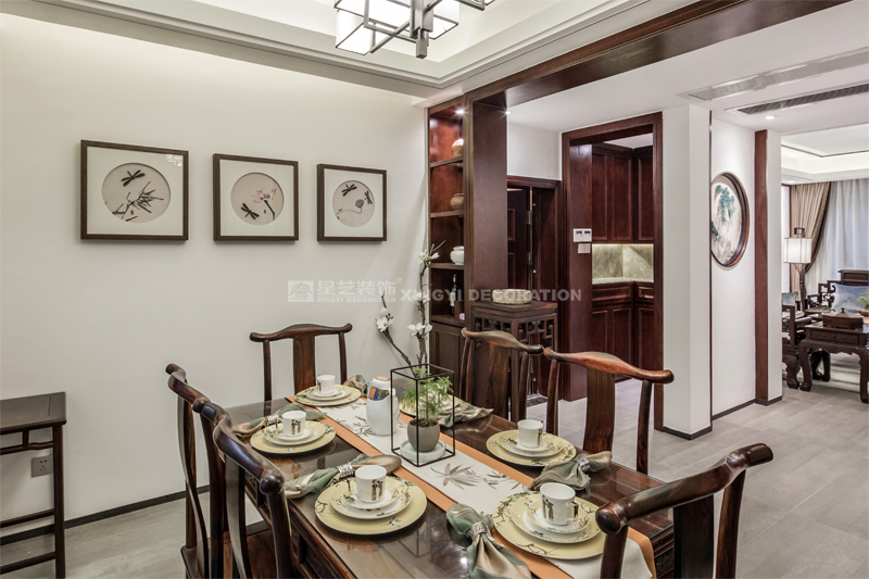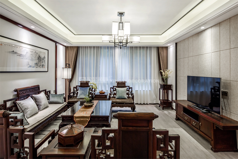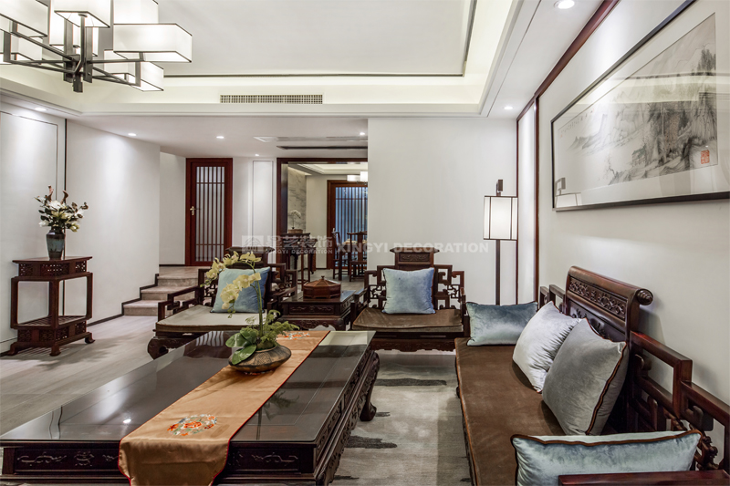 業主是個十分看重文化底蘊的人,所以比較偏愛新中式風格設計,因此設計師在設計時需要用有限的空間設計出無限的意境,把業主的古典情懷表現出來。靈動飄逸的盆景搭配古香古色的原木家具、考究方正的中式燈飾和淡雅別致的水墨畫飾等,將新中式的神韻烘托得淋漓盡致,不僅極具質感,還將整個空間的意境提升了不少。入戶過道處設計得極為簡約,硬朗的線條將空間分割得極為方正,搭配上淡色的畫飾,將空間的延續性無限拉長。“時得悠然意,一拋名和利。茶香品斜陽,塵心難自還。”茶間的設計更能讓業主在紛擾的繁世中辟得一處幽靜之地,讓疲勞的心靈有所歸宿。