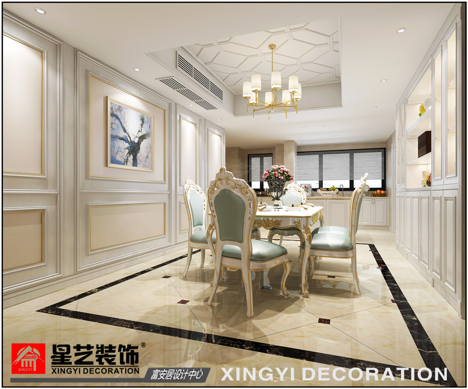 本案在空間格局上改動比較大、因為業主買的是二手房已經拿到了房產證的情況下、我們在次臥和原有的陽臺有很大的加建面積。把原本沒有采光的小廚房改成了衛生間、餐廳旁邊的陽臺和陽臺加建的地方改成了開放式廚房、把原有的衛生間位置和餐廳做成了闊氣的餐廳。從入戶玄關進來、南北通透、空間視覺感非常大氣。天面的石膏線、墻面的護墻板和軟包、地面大理石踢腳線、拼花地磚整體的搭配更附有層次感、白色的護墻板的質感使空間增加幾分透亮