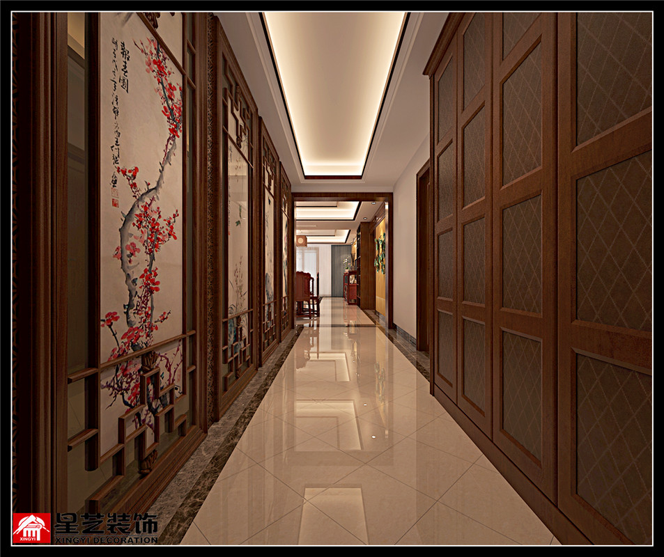 南寧星藝裝飾馬瓏萍設計師專業設計的保利大江郡180平中式風格裝修案例,這位業主非常有意思,是名四川人在廣西定居,有一對非常靈氣的龍鳳胎,她把兩個大套間讓出來給兒女住,自己住稍微小一點的房間,面朝陽臺,偶爾早晨可以朝江做做瑜伽,十分愜意。由于是精裝房,因此原結構沒有調動,客戶喜歡傳統中式的味道,定位為中式風格,全房裝飾主題圍繞著山水、花卉、喜鳥、營造一種詩情畫意的意境,小孩房則依據年輕兒女喜好做了偏為時尚的設計。在入戶長過道的設計上,我花了個小心思,將業主名字中帶的菊字容入設計中,把入戶長過道打造成了畫廊,以木飾雕花作畫框,加入黑鏡,帶些靈動,畫框內裱上梅蘭竹菊的中式水墨畫,悠然雅致。