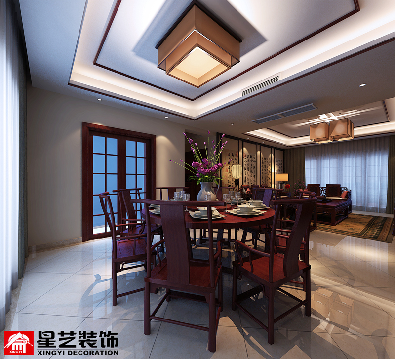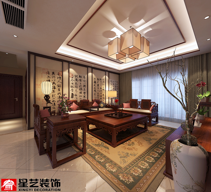南寧星藝裝飾馬瓏萍設計師專業設計的保利大都郡110平中式風格裝修案例,這是一名老客戶介紹的朋友,房子買的是精裝房,在工程項目中,增添木工柜子以及裝飾背景墻,業主偏愛紅木家具,所以裝修風格定位為中式風格,圍繞家具濃重的中式味道的雕刻,我在裝飾背景墻面做了呼應的設計,電視背景墻木飾面對稱處設計八個有吉祥寓意的定制雕花,噴上金漆,突顯華貴,搭配大氣的大理石瓷磚相襯,沙發背景墻優美古詩,餐廳清明河上圖壁畫體現的繁華景象,古香古色賦予情懷。