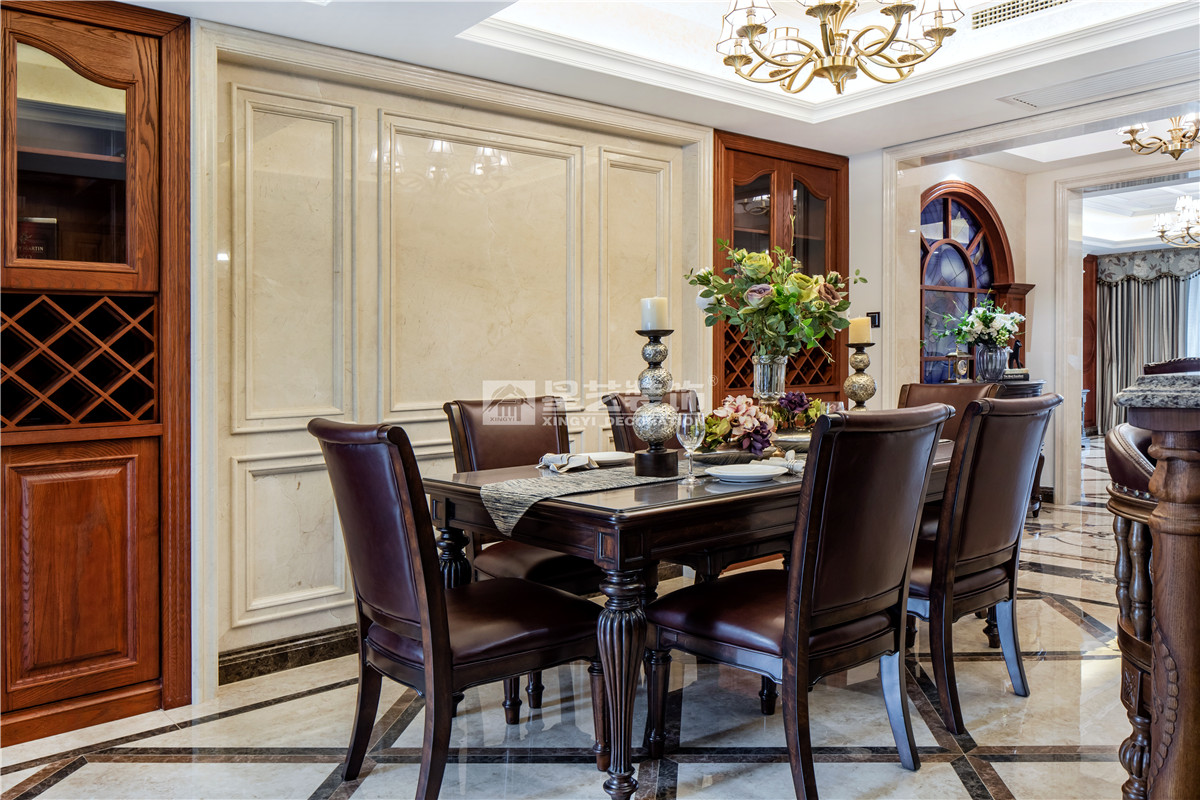 這套案列客廳選用暖色為主色彩。充溢美式元素的客廳吊頂讓空間顯得愈加華貴。玄關處采用彩色玻璃屏風以及地面的拼花使得空間更絢麗多彩。門套線選用的石材與客餐廳的背景墻相呼應,使得整個空間何諧上檔次。