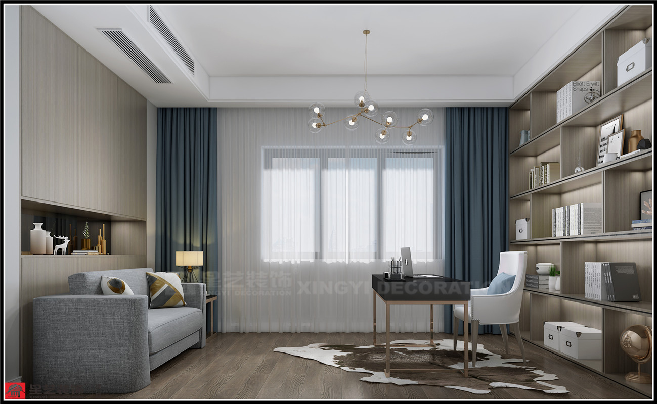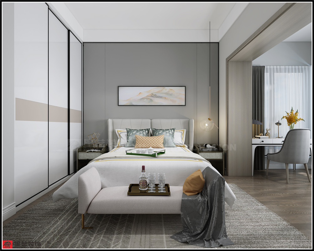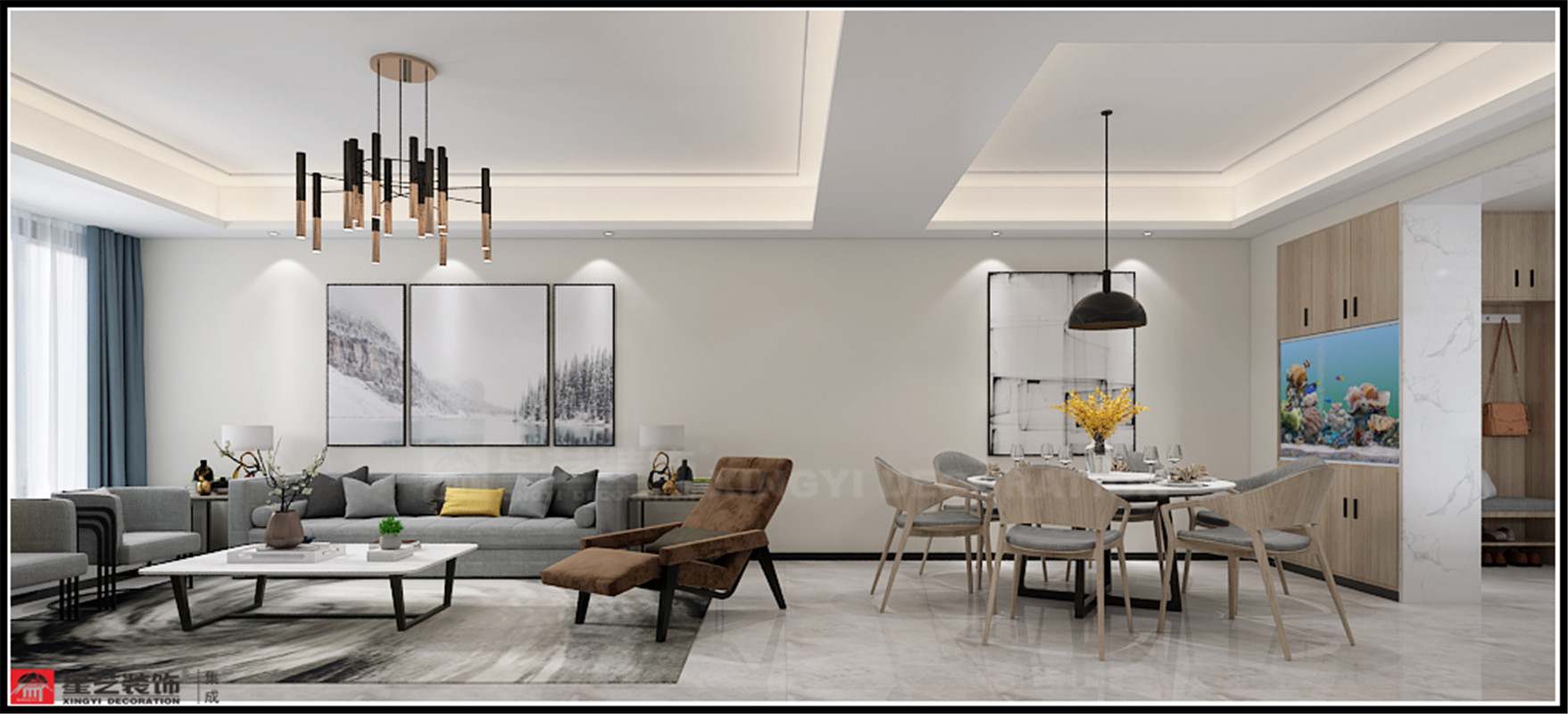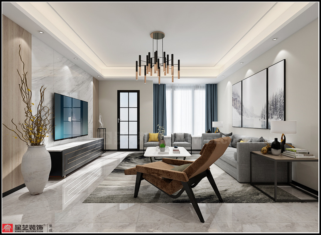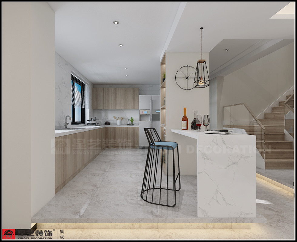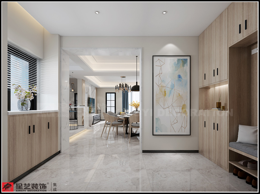 的室內空間。這個案例裝的比較簡潔明朗,地面運用了一些木紋磚結合墻面的淺咖啡色再加上暖白色的燈光,突出了這個空間的自然祥和之美。