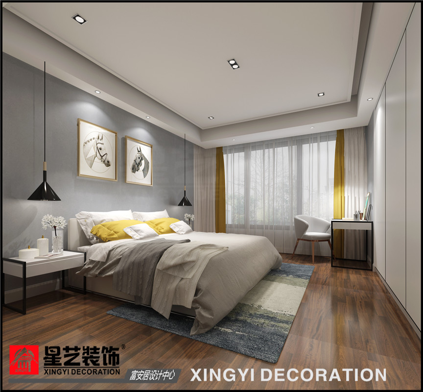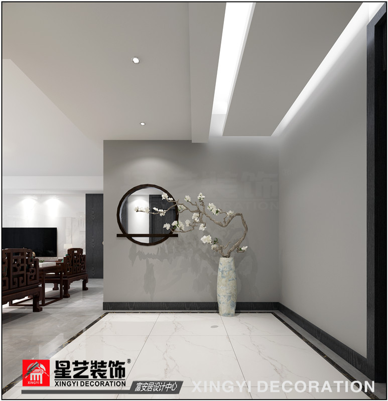 業主是一位90后妹子,房子為父母贈與的婚房,同時父親贈送一套紅酸枝十件套沙發及餐桌椅,為了搭配起這套家具,把風格定為新中式風格。要求不要過于中式,希望簡約有意境。考慮到業主年紀較輕,傳統的中式風格與其不符,業主又喜歡冷色調,因此在設計上采用了黑白灰為主調的新中式風格。以塊面色彩作為裝飾的主要手法,搭配具有中式元素的小裝飾,大面積的白墻搭配黑色護墻板,黑白碰撞使空間層次分明,大面積灰色地面作為過度色彩,令空間既有中式韻味又不乏現代風格的簡練大氣之感。