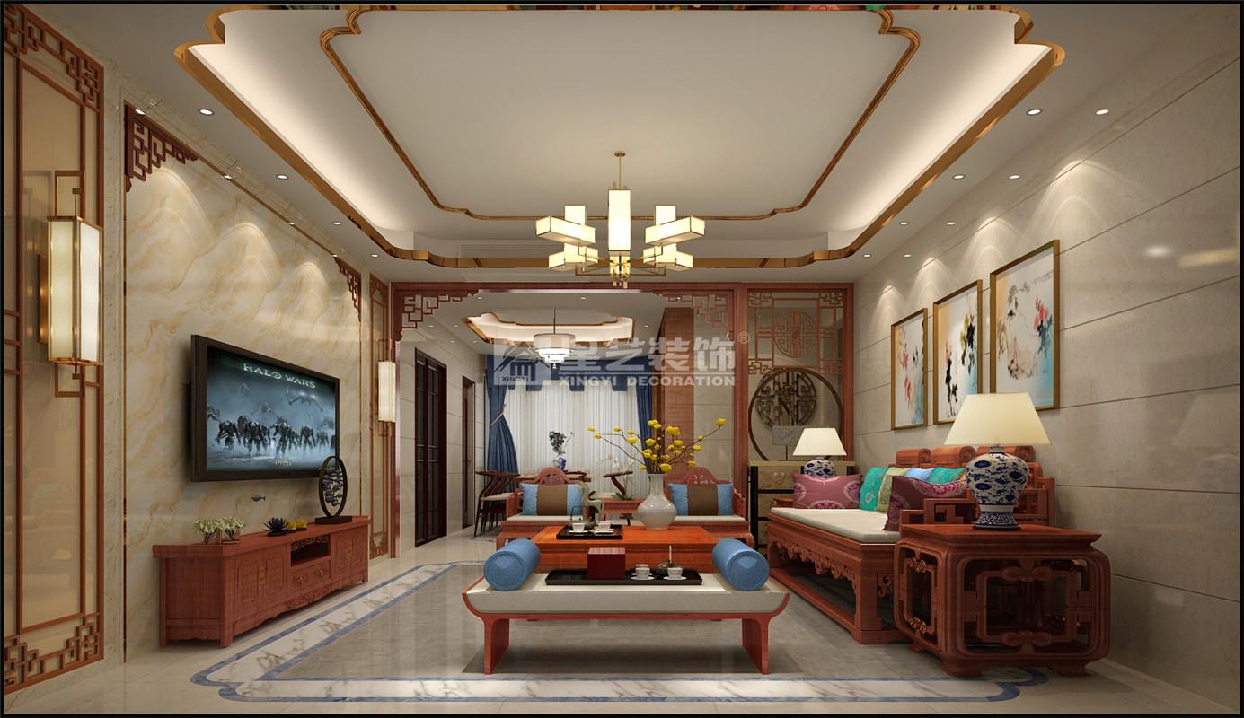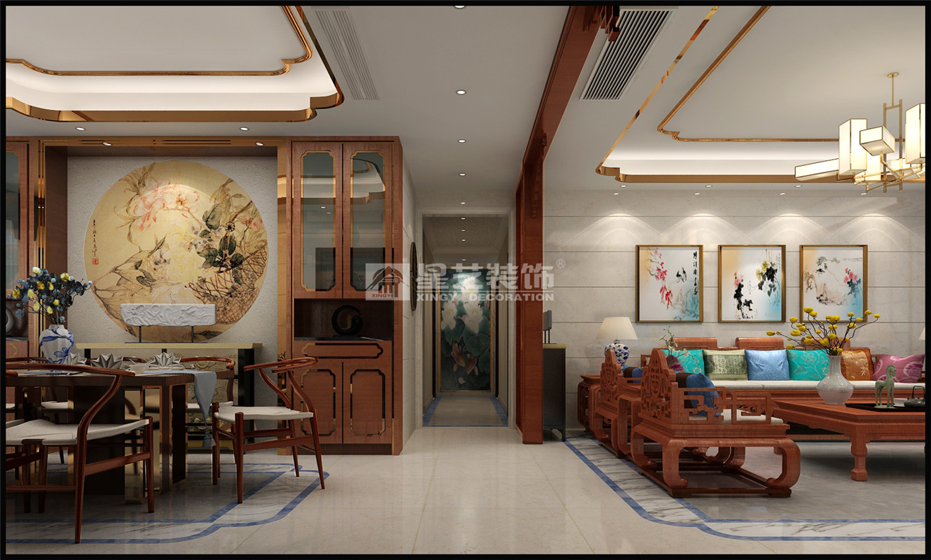 本案講究空間的層次感,在需要隔絕視線的地方,則使用中式的屏風或窗欞、中式木門、工藝隔斷、簡約化的中式“博古架”,通過這種新的分隔方式,單元式住宅就展現出中式家居的層次之美。再以一些簡約的造型為基礎,添加了中式元素,使整體空間感覺更加豐富,大而不空、厚而不重,有格調又不顯壓抑。