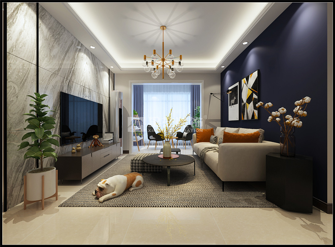 你的居所如你一樣,冷淡之外帶著溫馨。藍色、石材、黑鈦鋼為冷系,橙色、木質、棉麻為暖系,冷暖搭配整體設計表達個性的同時兼具溫馨感