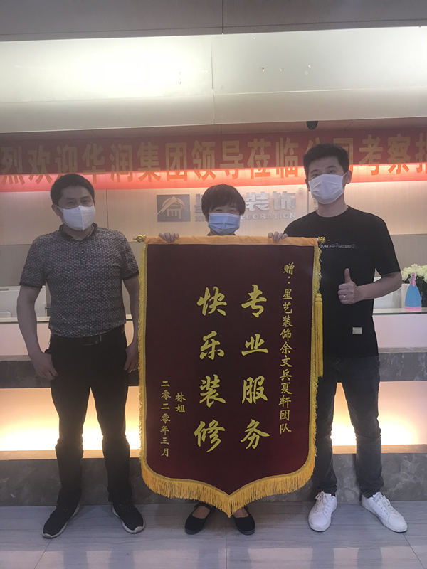 業(yè)主林姐為感謝項(xiàng)目經(jīng)理余文兵和設(shè)計(jì)師夏軒,專(zhuān)程來(lái)星藝送錦旗,感謝項(xiàng)目經(jīng)理和設(shè)計(jì)師的認(rèn)真負(fù)責(zé)。認(rèn)真工作一定會(huì)獲得認(rèn)可的,我們一定還會(huì)繼續(xù)努力提升自己的工作服務(wù)