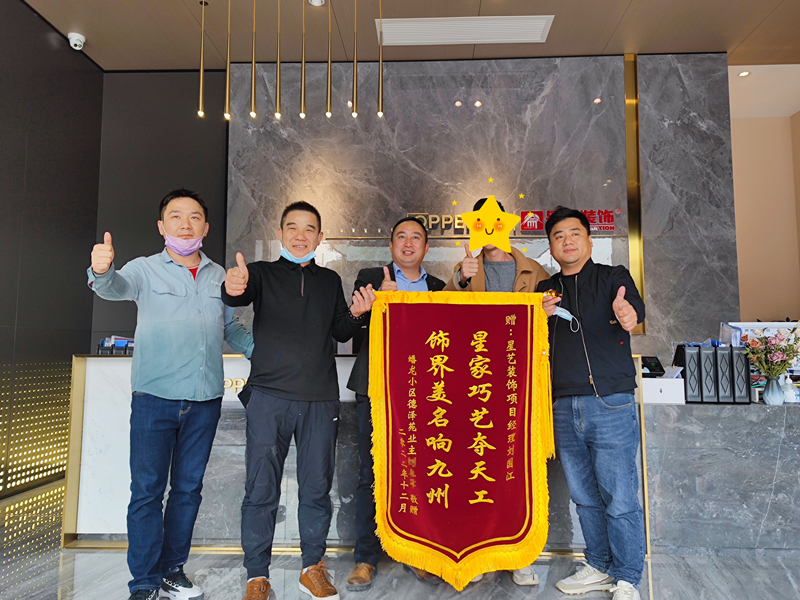 2022年年底,蟠龍小區(qū)德澤苑業(yè)主劉先生來到星藝裝飾歐派整裝大家居館,附贈(zèng)錦旗一幅,錦旗內(nèi)容:星家巧藝奪天工 飾界美名響九州 ,星藝集成整裝總經(jīng)理,項(xiàng)目經(jīng)理,設(shè)計(jì)師接受錦旗并與業(yè)主一起合影
