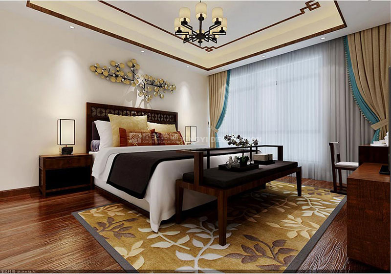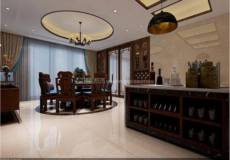 此戶型為6房2廳的結構,其中5間主人的房間都有獨立的衛生間,使得日常生活使用非常的方便??蛷d、餐廳的面積比較大,設計師通過1米高的白墻和中式隔斷巧妙把它們分割開來,但從視線和空間效果來看它們又是緊密聯系在一起的,達到了“隔而不斷”、又有中式園林中“借景”的效果。電視背景墻采用個性化的復合木地板上墻,簡潔大方,通過隱形門的設計巧妙的把多功能房的門修飾起來。餐廳設置有一個吧臺區域,既使用又美觀。業主不喜歡太繁瑣的裝飾,所以每一個臥室都沒有按常規設計背景墻,只是通過吊頂造型和墻面顏色營造不同的氛圍。