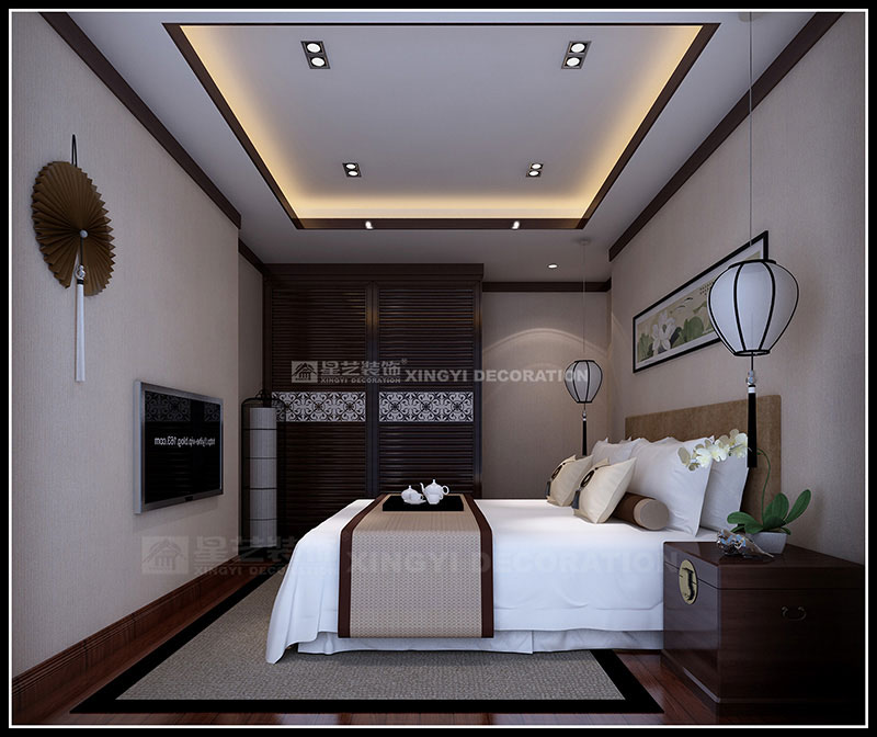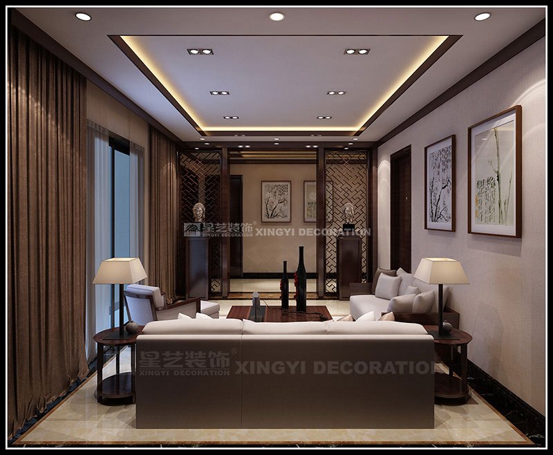 本案設計為現代中式風格,以東方傳統文化內涵為設計元素,去掉繁復細節,以現代簡約的造型藝術詮釋東方神韻。運用帶有歷史韻味的裝飾符號:選用深色木制家具及極少的金屬裝飾;色彩以深木色、米黃、咖啡等色調相配合;舒適、自然地把東方味道發揮得淋漓盡致,看似簡單隨意卻又經得起時間的推敲。通過簡潔、大方的造型營造出富有生命力和文化內涵的藝術空間。
