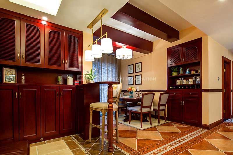 使用自制木質(zhì)臺面和磚砌成的吧臺,是為了營造一種浪漫、溫馨的感受。也起到分割居室空間的作用。配合毗鄰的“爵士餐吧椅”,可以使客廳的場景更加有層次感,并且制造出美式鄉(xiāng)村別樣的小餐吧。